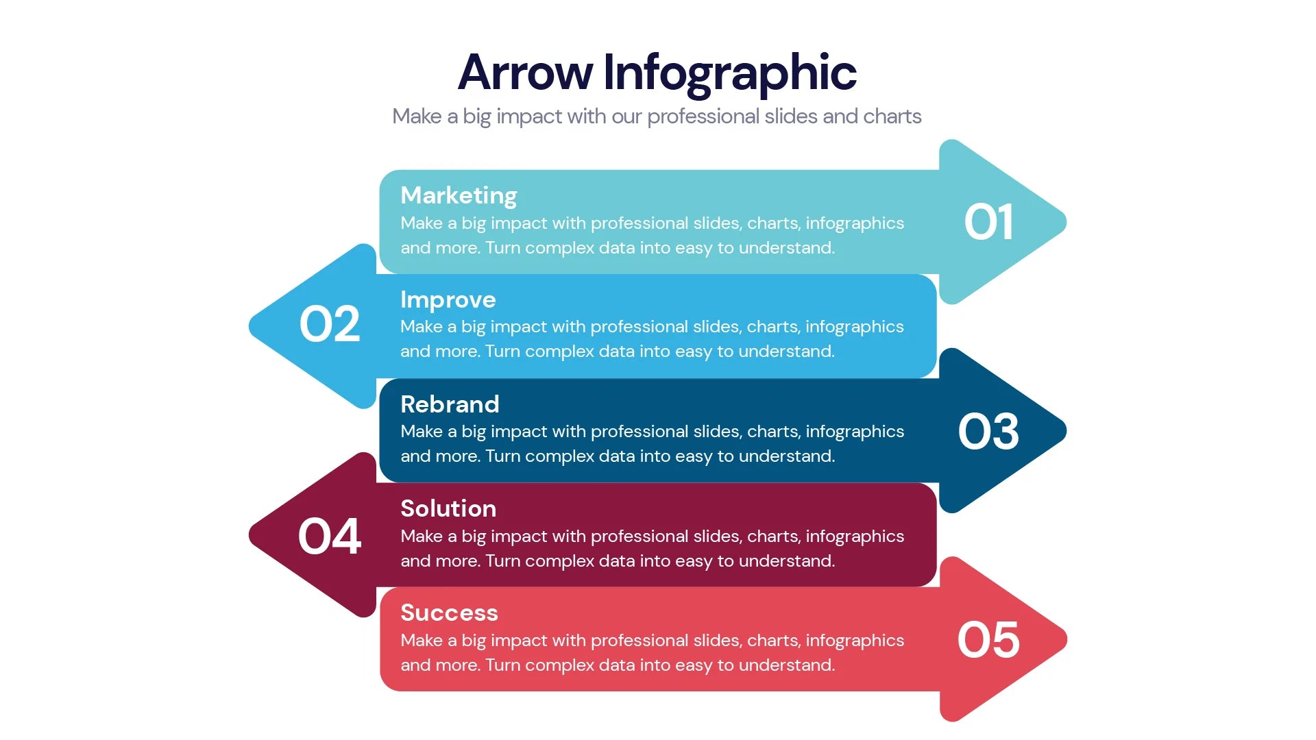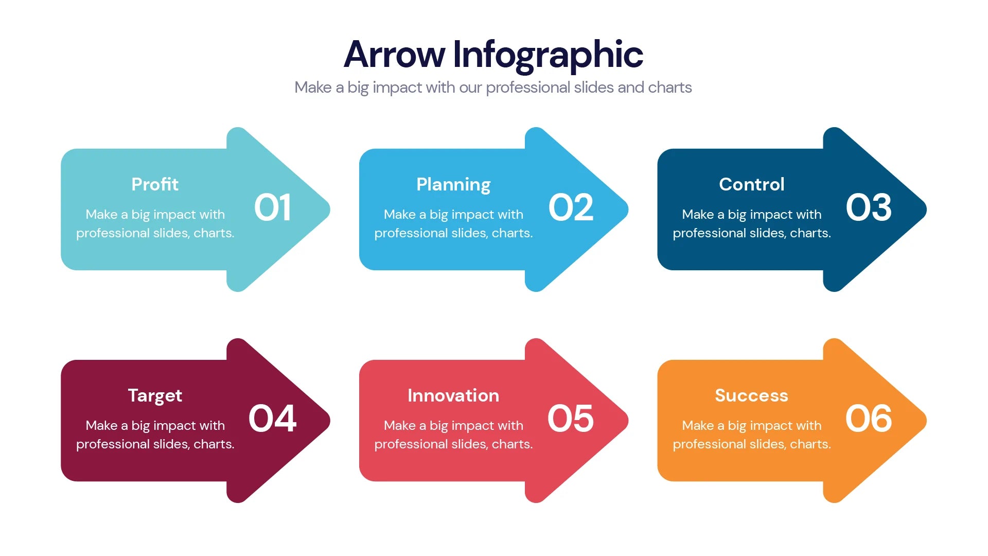| Tired of creating a boring presentation that no one wants to look at, let alone listen to? Let PowerPointX make all the difference. Our infographics PowerPoint templates are built with both beauty and convenience in mind, guaranteed to make any presentation stand out far and above the rest. Whether your goal is to draw attention and impress viewers or simply convey information in an orderly fashion, PowerPointX is here to take your presentations from stagnant to sparkling. Why waste hours rifling through dusty old design libraries when you can quickly customize our modern Arrow Infographic slides instead? Each template has been carefully crafted by professionals so that you can give polished presentations that are sure to leave a lasting impression! If you’re short on time or don’t have the skills for customizing templates, don’t worry – we’ve got you covered with our Arrow Infographic Templates ready-to-go package. This collection of pre-made slide designs is comprehensive, so instantly activate sophistication without breaking into a sweat. Mix-and-match slides however you wish with powerful drag-and drop functionality while saving yourself time and energy needed elsewhere. Before long, your audience will be captivated by your dazzling display of information – it will undoubtedly be easier for everyone present to understand and remember content when delivered clearly through appealing visual format that PowerPointX infographics provide. Trust us; when they see what your presentation looks like after using our services, they won't forget it! |